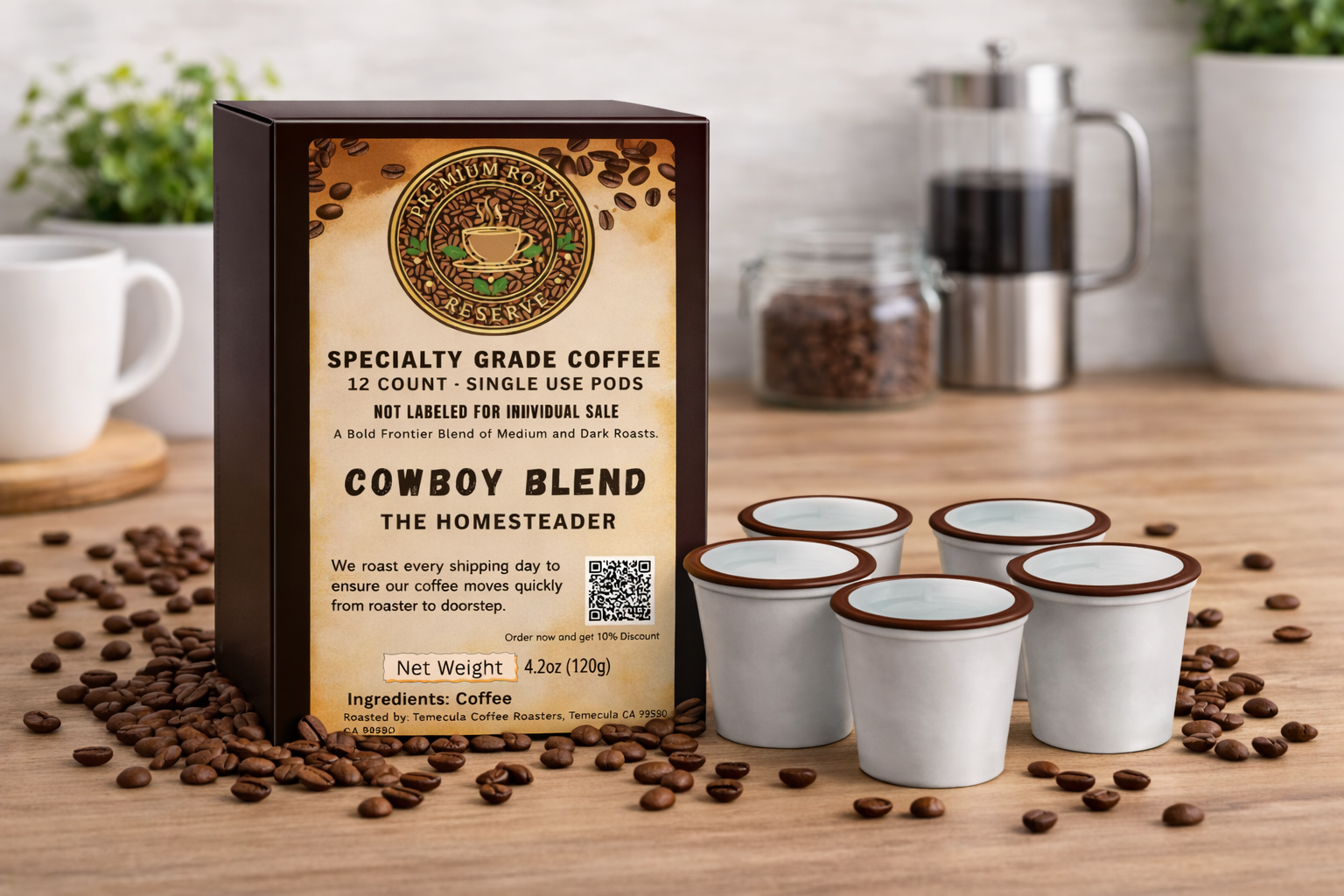 Ride into your day with the smooth boldness of our Cowboy Blend Coffee Pods from Premium Roast Reserve.